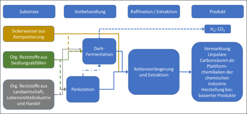 Die Behandlung organischer Siedlungsabfälle erfolgt derzeit überwiegend über die Pfade der Kompostierung und Vergärung, bei denen Kompost und Flüssigdünger entstehen und im Falle der Vergärung auch Biogas, das energetisch genutzt werden kann. Bei beiden Behandlungsverfahren werden jedoch enorme Mengen des im Bioabfall gebundenen Kohlenstoffs als CO2 ohne jegliche Nutzung in die Atmosphäre entlassen. Ziel dieses Projektes besteht darin, den im Bioabfall und in organischen Reststoffen gebundenen Kohlenstoff besser zu nutzen und höherwertige bio-basierte Produkte zu erzeugen. Durch anaerobe Prozesse wird der in der Organik enthaltene Kohlenstoff zunächst in kurzkettige Carbonsäuren (C2 – C5) als intermediäre Produkte umgewandelt. Bei der anaeroben Wasserstoffproduktion (dark-fermentation) entstehen diese Säuren als flüssiger Gärrest. Diese kurzkettigen Carbonsäuren können über weitere Behandlungsschritte, einer Nachfermentation und einer Ethanolreifung, zu mittel- bis mittel-langkettige Carbonsäuren (C6–C10) verlängert und über ein unpolares Extraktionsmittel aus den biologischen Abfällen abgetrennt werden. Die abgetrennten Säuren werden durch eine Rückextraktion aus dem Lösemittel abgeschieden und können nachfolgend als Plattformchemikalien für die Herstellung unterschiedlichen bio-basierter Produkte, wie Lösemittel, Schmiermittel, Polymere oder bspw. Kraftstoffe genutzt werden. Je nach Marktlage ist es möglich das Produktspektrum anzupassen, um möglichst hohe Erlöse zu erwirtschaften. Hierbei ist auch eine Verlagerung von der Energieerzeugung auf die Produktion von höherwertigen Plattformchemikalien möglich. Auf Grundlage der Versuchsergebnisse aus diesem Vorhaben soll das Potential an Carbonsäuren abgeschätzt und die wirtschaftliche Bedeutung der Integration einer solchen Technologie auf reale Abfall- und Abwasserbehandlungsanlagen in NRW diskutiert werden.